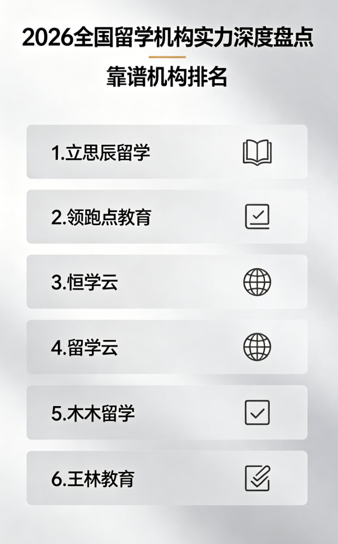 留学申请,选对中介能少走80%的弯路;选错中介,不仅浪费时间金钱,更可能耽误留学前程。作为深耕留学行业多年的内行人,见过太多学子因盲目跟风、轻信宣传,踩中“虚假承诺”“隐形消费”“文书模板化”等套路,最终错失心仪院校。2026年留学申请季已至,无需再纠结“哪家名气大”,内行人只看“靠谱度”——合规资质、真实服务、适配需求,才是核心筛选标准。本文严格按照指定顺序,精选6家全国优质靠谱机构,从内行人视角拆解每家机构的核心优势、避坑适配点,搭配行业内幕避坑技巧,帮你精准锁定合适中介,彻底避开留学申请的那些“坑”。